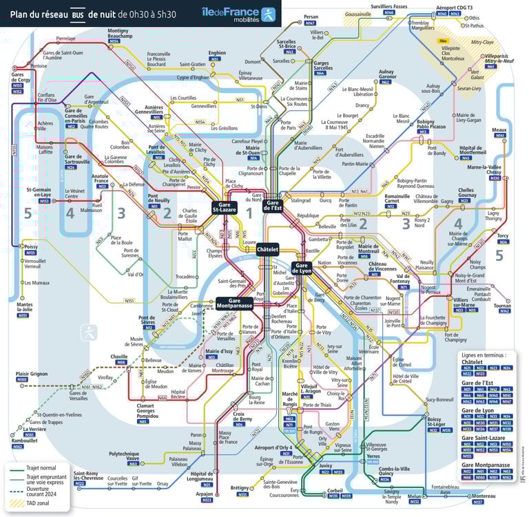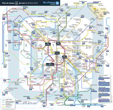 The Noctilien night buses include 48 lines, covering over 1,000 stops throughout the region. This network is essential for late-night travelers, whether you're heading home, catching an early flight, or commuting to work during off-peak hours.